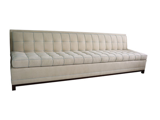 Sophisticated modern lounging meets classically crisp tailoring, with details like biscuit tufting and silk piping. Inspired by cozy, comfortable dining booths found in classic Parisian cafes. Align multiples to create longer seating.